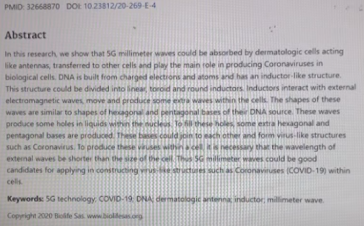 - Technologie 5G et induction du coronavirus dans les cellules de la peau [5G prouvée être cause de symptômes de grippe] (PMID 32668870 « retiré » après le 16 juillet 2020 par l’éditeur sur PubMed NCBI [+ Articles similaires]) : « Résumé. Dans cette recherche nous montrons que les ondes millimétriques 5G pourraient être absorbées par les cellules dermatologiques agissant comme des antennes transférées aux autres cellules et produisant le même rôle que le coronavirus dans les cellules biologiques. L’ADN est construit à partir d’atomes et d’électrons chargés et a un inducteur comme structure. Cette structure peut être divisée en inducteurs linéaires, toroïdes et ronds. Les inducteurs interagissent avec les ondes électromagnétiques externes, meuvent et produisent des ondes supplémentaires avec les cellules. Les structures de ces ondes sont similaires aux structures de base hexagonale et pentagonale de leur origine ADN. Ces ondes produisent quelques trous dans les liquides à travers les noyaux. Pour former ces trous des bases hexagonales et pentagonales supplémentaires sont produites. Ces bases peuvent se rejoindre entre elles et former des virus comme structure telle que le coronavirus. Pour produire ces virus à travers une cellule, il est nécessaire que la longueur d’onde de l’onde externe soit plus courte que la taille de la cellule. Ces ondes millimétriques 5G pourraient être de bons candidats appliqués en construction de structures de virus comme les coronavirus (covid-19) avec les cellules».